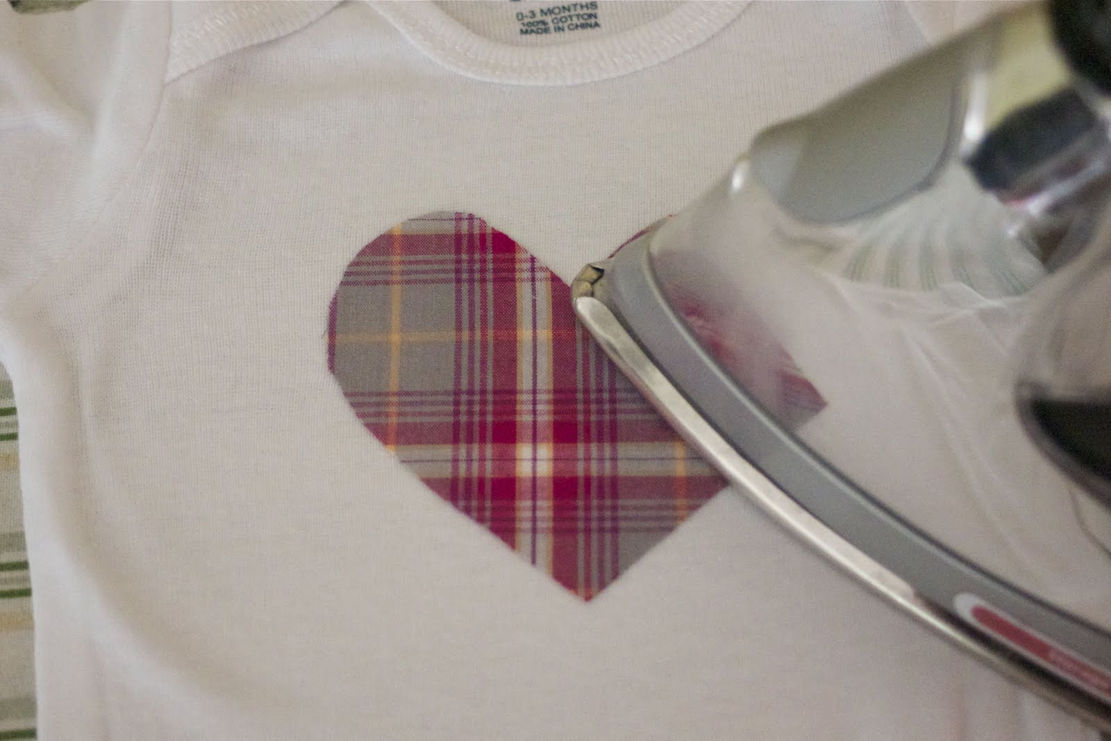 Carefully flip the fabric over and place it on the desired location on the onesie. Using the heat from your iron, press the fabric until the tape fuses it in place.